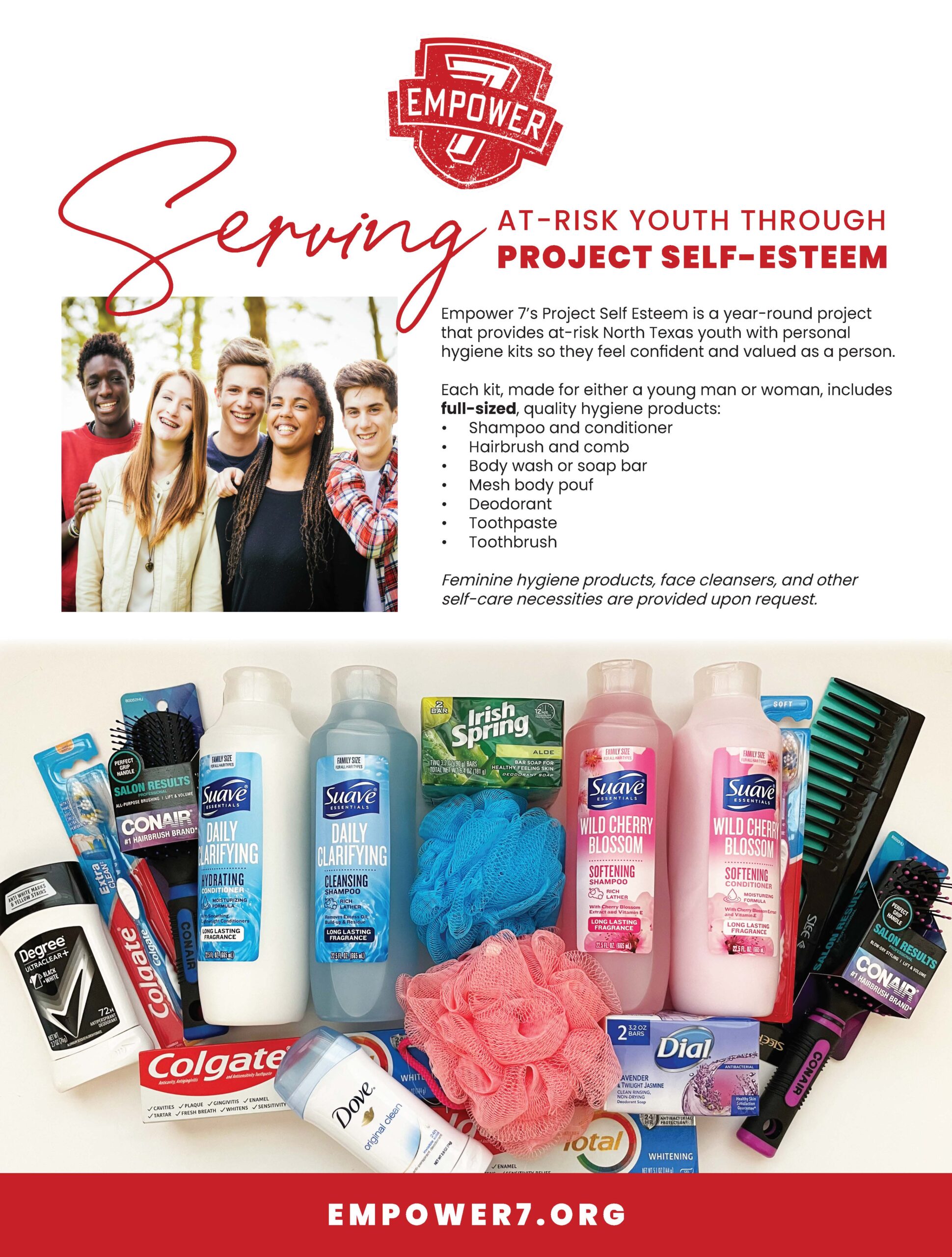 Empower 7’s Project Self-Esteem is a year-round project that provides at-risk North Texas youth with personal hygiene kits so they feel confident and valued as a person.